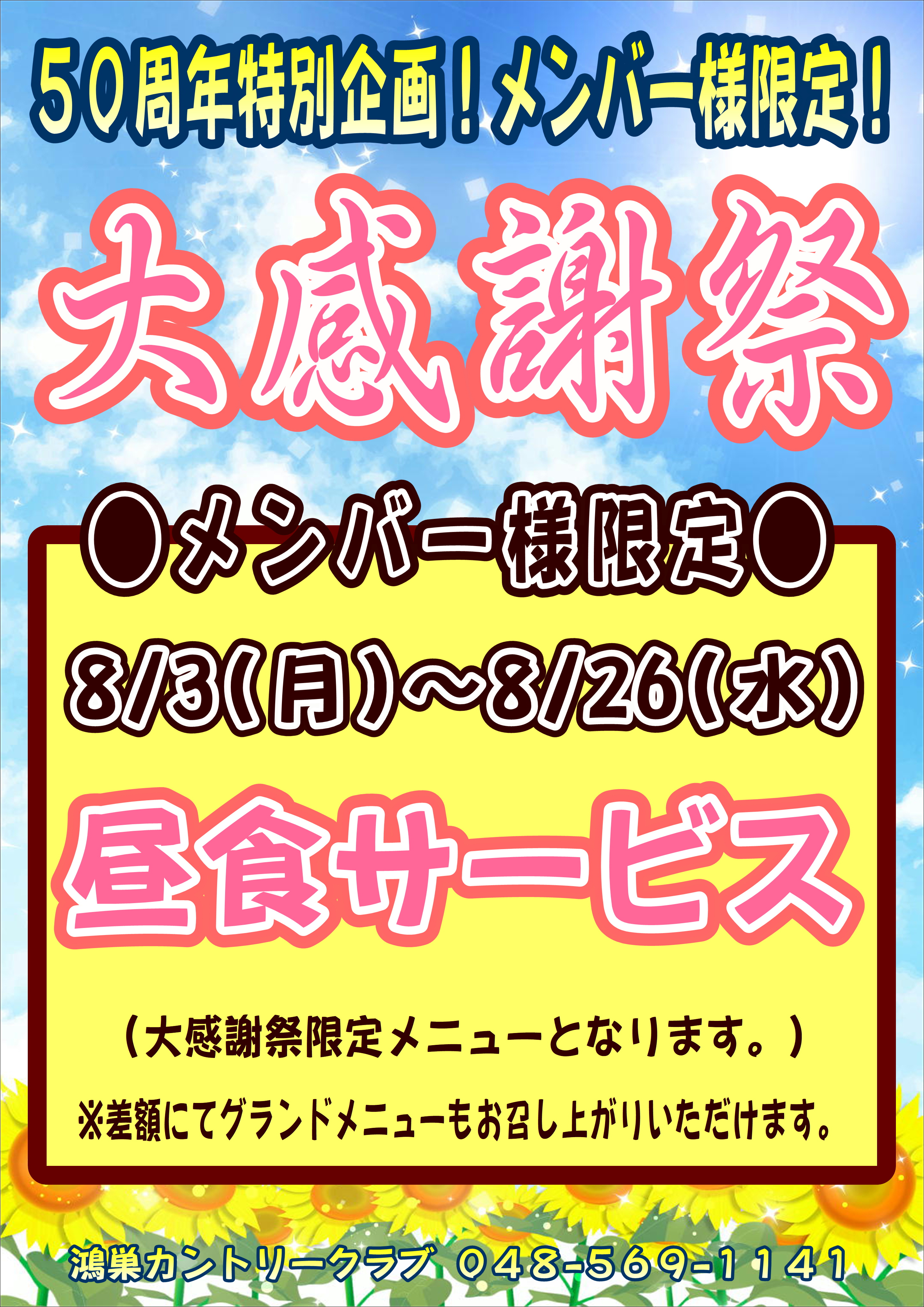 50周年特別企画として8月3日(月)~26日(水)の期間中、大感謝祭としてメンバー様限定で昼食サービスを実施いたします!皆様のご来場を心よりお待ち申し上げております!!